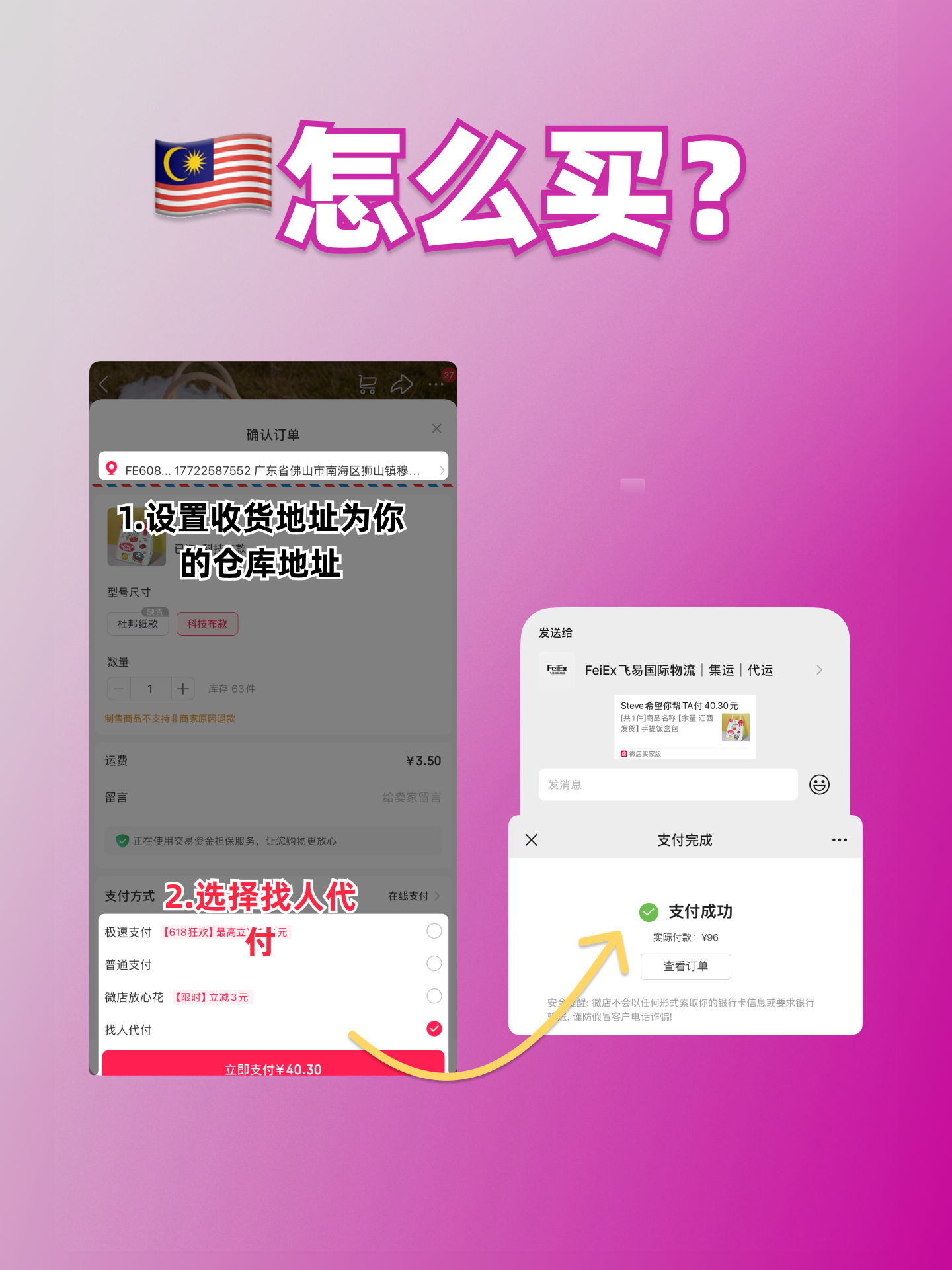 将订单付款链接发送给 FeiEx 马来西亚代运。我们会即时处理代付,并同步跟进后续发货。
